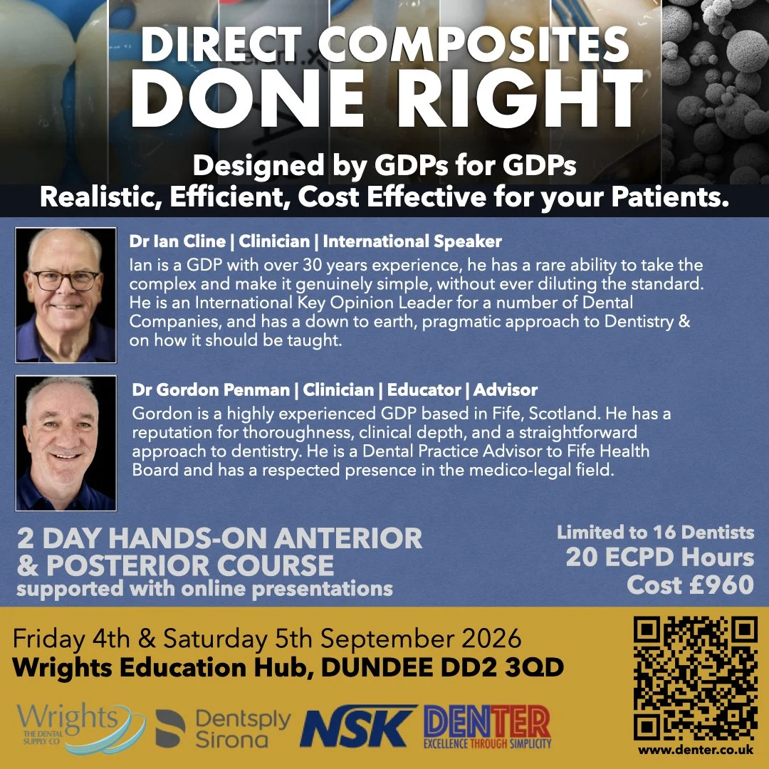 Whether you’re a recent graduate building your Restorative & Aesthetic skills or an Experienced Clinician looking to sharpen your anterior composite & posterior techniques, this intensive hands-on 2 days is designed to take your work to the next level. Through practical, step-by-step guidance, you’ll gain the tools, techniques, and insight to deliver beautifully natural and predictable results. Ian & Gordon are both wet-fingered Dentists with considerable experience of running hands-on courses.
